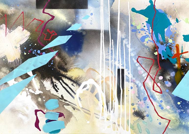 Series: DREAM "dream“ XV is an expressive abstract painting 70 cm/27.56 in W x 50 cm/19.68 in H, 3.8 cm/1,5 in deep. The painting is mixed media ( acrylics, spray paint, dripped acrylics, soft pastels, ink ) on high quality canvas. I love the song "Imagine" written by John Lennon. Its lyrics encou...