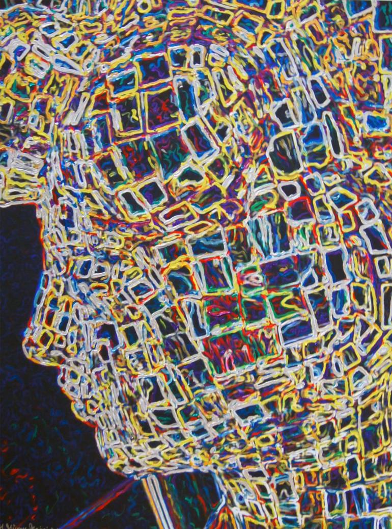 The painting "Dreaming" by the artist Manuella Muerner Marioni was conjured up on the canvas with lines and individual brushstrokes that look like neon lights using Pearlacrylic paint. They give the face an extraordinary expression, as the background is black and this creates a contrast with the bri...