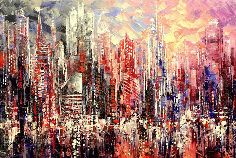 This is an original palette knife cityscape painting. Sides of the canvas are painted dark gray and can hung with or without frame. Protective coat of satin varnish applied. Wire attached. The painting is signed on the front and the back and delivered directly from my studio.