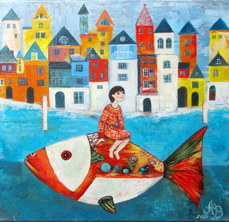 Embrace the spirit of adventure and the magic of dreams with this unique naive art painting, perfect as a gift or a statement piece. This whimsical scene features a young girl sitting atop a large, gentle fish, gazing into the distance over a river or sea. Behind her lies a vibrant village of colorf...