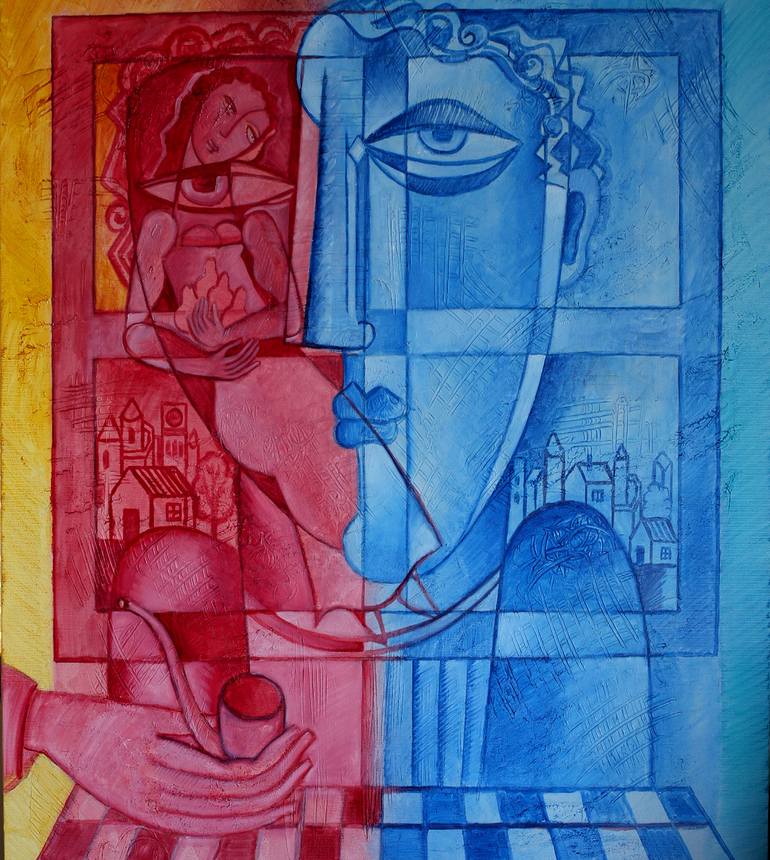 Original oil artwork by VAN HOVAK My paintings mostly represent human souls and philosophy of life. My method through numerous overlaying materials (oil, acrylic paints, mix media, textures) find and shows the Spirituality of man and world. Lovers' painting shows the unifying process of two lovers.
