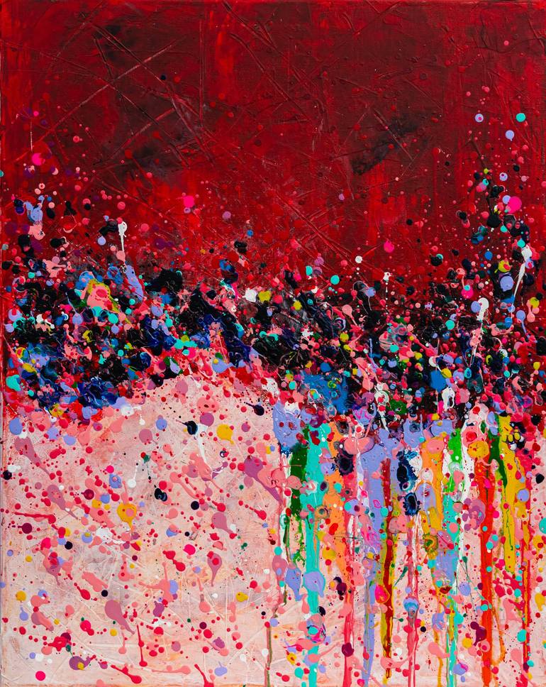 Behold 'Drops of Love,' an abstract creation that speaks volumes through its vibrant yet understated dance of colors. At first glance, the upper portion captivates with its rich, deep red tones that exude an emotive resonance. It almost embodies a heart-like presence, a reservoir of profound emotion...
