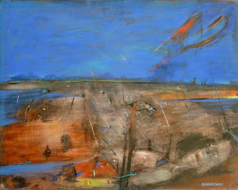 An abstract landscape - Bright, vivid. A sunburnt country, ships approaching in the horizon. The land is personified by a figure (bottom right of painting) - This figure embodies the land - Showing concern for the new approaching convoy in the far distance.