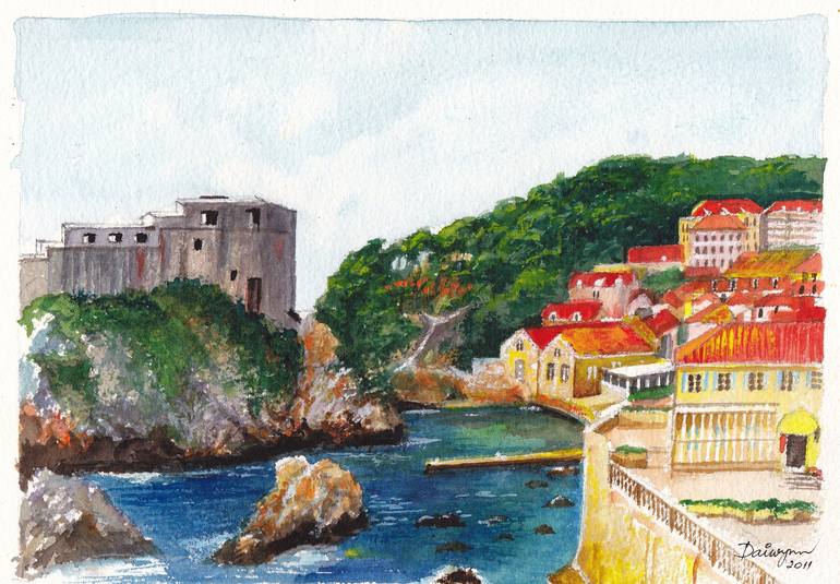 A small harbour beneath the fortification in Dubrovnik, Croatia. Watercolour painting by Dai Wynn on 300 gsm Arches "rough" cotton paper. 21cm X 29cm (8" X 11") approximately.