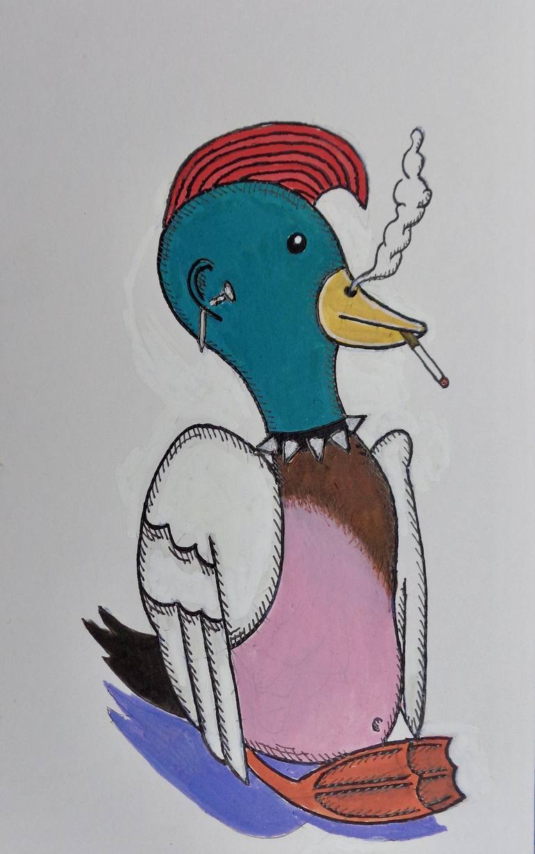 This drawing/painting began as a "blind" scribble. in it I saw the image of a punk rock duck that smokes.
