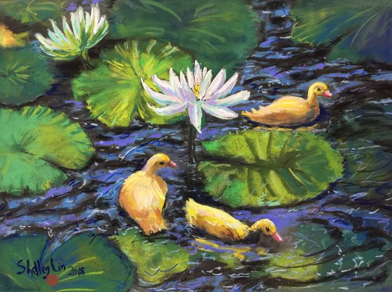The pastel painting illustrates the tranquil scene in a lotus blossom pond with ducklings swimming. The reflection of the blue sky on water is emphasized in randomly looks strokes. Also the bright color of the ducklings is highlighted to make the painting lively.