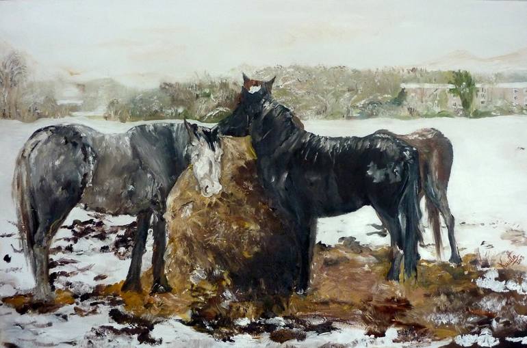 Painted in Oil, on a stretched Box canvas, this is part of my NEW collection called 'Snowflakes'. I absolutely love horses. This lot looked quite happy munching the hay despite the snow all around them, near the Durham castle in England this February (2013). Snowfall in Britain has been affecting us...