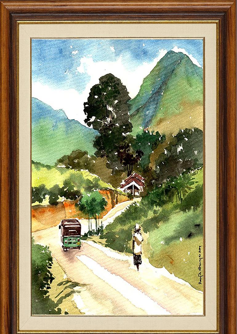 The sunlight shone directly on to the dusty road, the trees and bushes by the roadside were covered in dust. A man is seen walking the street towards the village center, a tuk tuk makes its way passing him. In the background are lovely mountains… it is a beautiful day! 40836-LA-RAE