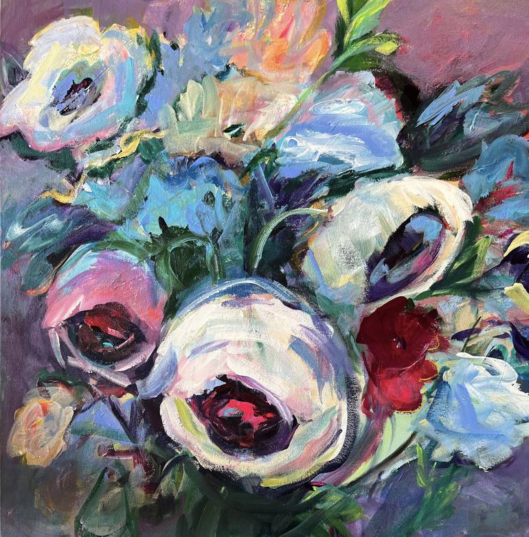 Floral painting inspired by a painting workshop in Lucca,Italy.Dynamic bold strokes are emphasized in this piece. The Italian atmosphere has brought out a new boldness in my work. My love of flowers is evident in most of my work.