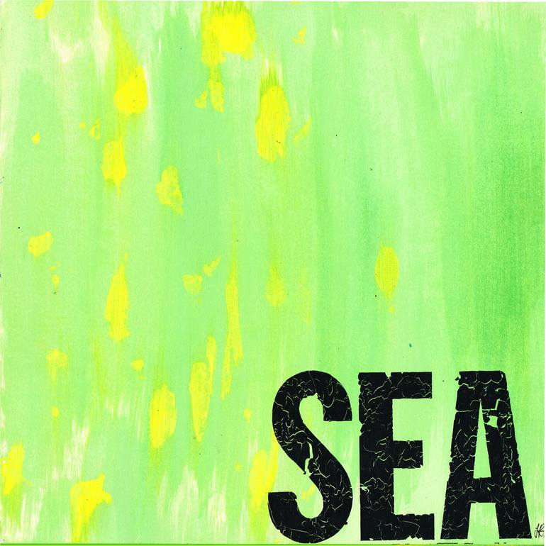 Statement painting - 'SEA' in Letraset transfer lettering (used in graphic design before the Mac computer).on a yellow acrylic painting on paper. Typography and the environment - issues such as sea plastic waste, pollution, eco-system, protest painting.