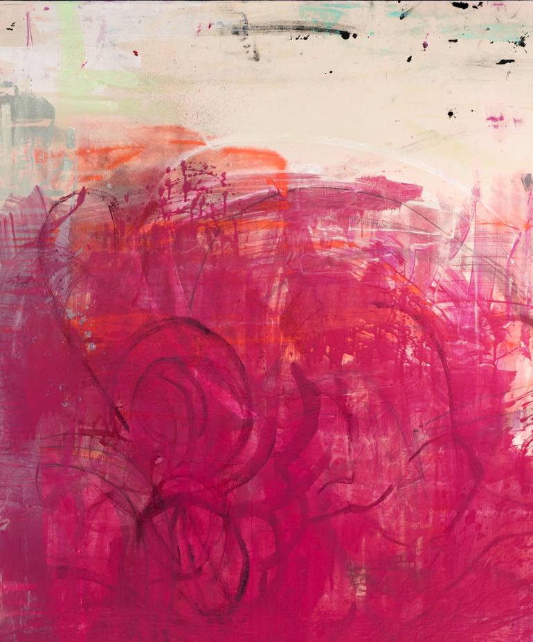 ** SOLD ** Oversized contemporary painting on canvas; magenta tones with a street art / graffiti edge. Gloss varnished, sides painted black, signed on back.