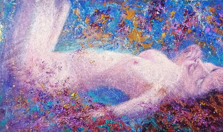 This contemporary abstract figurative painting features a reclining nude figure immersed in a vibrant, dreamlike environment. Rich layers of expressive impasto create a tactile surface that enhances the emotional depth of the piece. Bold strokes in purples, blues, golds, and reds merge the body with...
