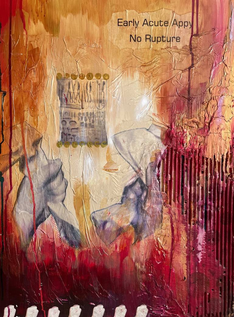 I created this mixed media piece in 2007 right after I had an emergency appendectomy. The title is what was on the paperwork as a description of my diagnosis. It is made on masonite with corrugated cardboard, acrylic paint, tissue paper, printed images and ink.
