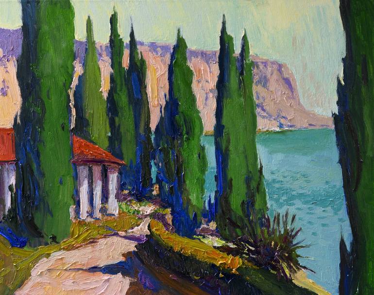 The velvet green of Cypress trees with the Mediterranean sea in the background reflects the vibe of the Mediterranean landscape. The artwork is full of life and a positive vibe. It is painted on Belgian oil-primed linen, stretched on wooden bars, and has a wire on the back to be displayed even with ...