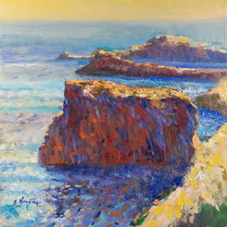 The artwork represents morning sunlight over the Pacific Ocean with impasto, impressionistic brushstrokes, and colors. The artwork is stretched on wooden bars and wired on the back for display even with no frame.