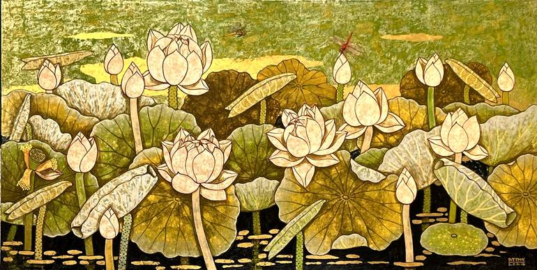 Bui Trong Du was born in 1976 in Hai Phong, he currently lives and works in Hanoi. During his studies and work, he traveled to many places in Northern Vietnam, falling in love with his homeland's landscape and imbued with traditional cultural values. Most of his artworks have an Oriental figurative style, sometimes mixed with a bit of impressionism or expressionism. With a simplified and stylized form of expression, the soft penmanship echoes Vietnamese folk paintings. Artworks such as summer lotus flowers, young women with lotuses, street corners, flower vases, and childhood memories such as flocks of birds, fishes, frogs, dragonflies... show the melody of beautiful, innocent life. Creating quality through mastering lacquer material is an important highlight in the work, it contrasts with the simplified form, this combination has created the artist's mark in the context of Vietnamese painting during the Integration.