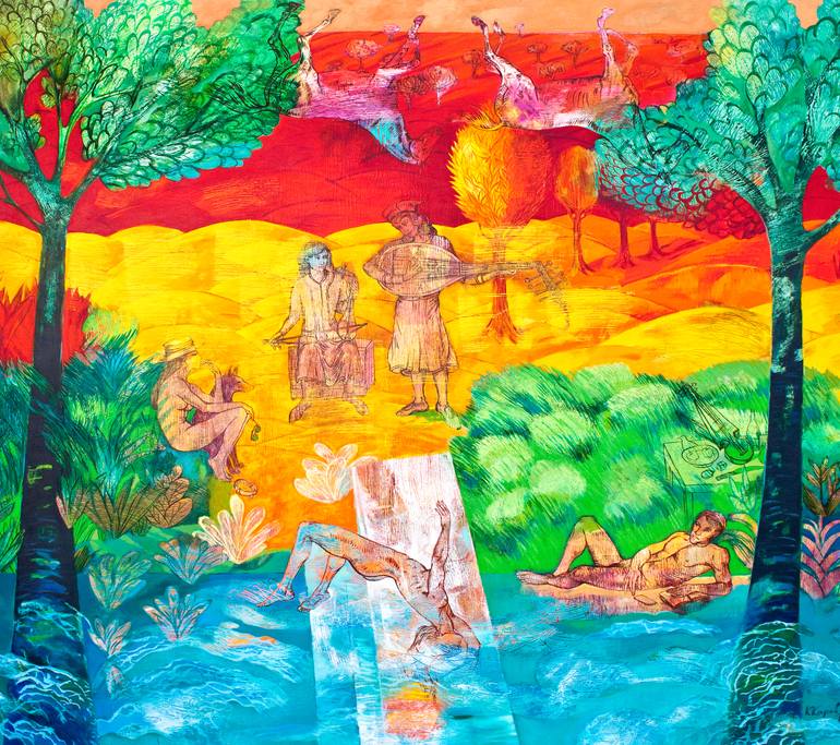 In my paintings I try to combine the sphere of physis, sensual pleasure, biology, and colors with symbolic elements evoking ontological and metaphysical meanings. My canvas constitute a mixture of textural and flat painting; Working on paper, I apply various techniques; I also press some parts of my linocuts. I am fond of order, symmetry and classic skills. At the same time, in painting and drawing I use techniques that allow chance decalcomania, grattage, dropping. At the first stage of my creative work I am quick and spontaneous. Then, at the next stages, I tame chaos and introduce order. As a result, my paintings form multilayer phenomenon. The layer of colors, regions of colors interactions constitute the foundation of my paintings. The material layer consists of the specific techniques I applied, textures, and deposits of paints. The layer of represented objects includes figures like woman, boy, tree, rhino. The layer of meanings consists of a story that usually finds no final on the picture.