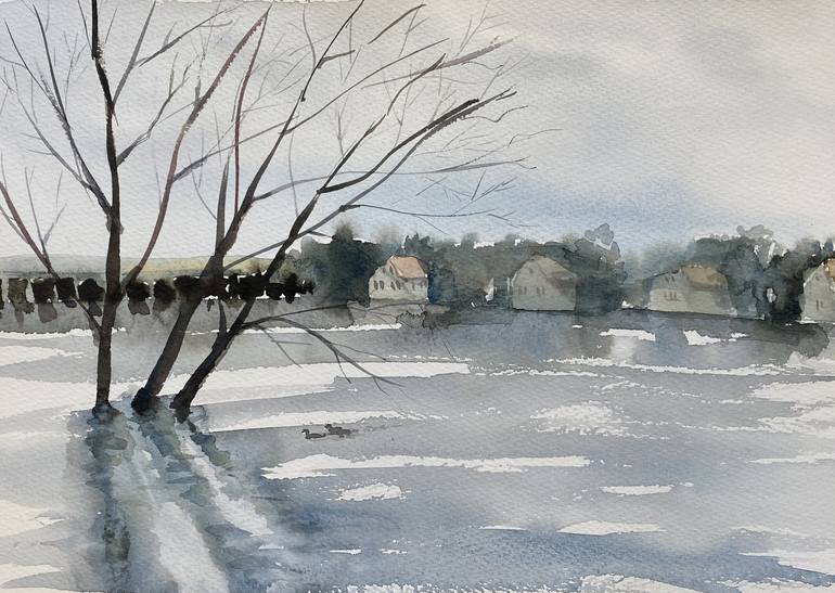 This watercolor painting vividly portrays the essence of early spring, a time of renewal and transformation. The scene captures a river that has overflowed its banks, its calm, reflective surface spreading across the landscape. Bare trees stand partially submerged in the water, their slender branche...