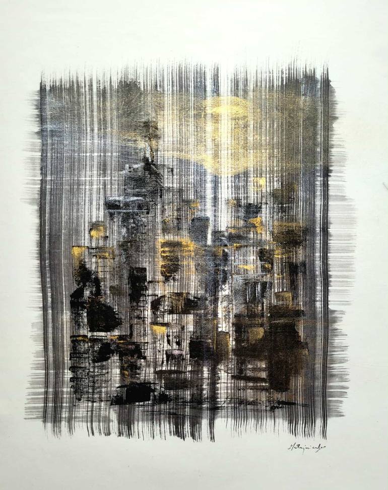 This original painting combines traditional ink techniques with gold accents on delicate Japanese paper. The use of ink, along with touches of gold and silver, creates a captivating visual experience. Inspired by cityscapes and created during a time of introspection, this artwork evokes a sense of ...