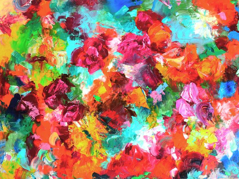 The painting was inspired by my girlfriend, my beautiful muse and cooperator. I gave to her oil colors onto the canvas and said - paint as you see from your emotion. And she made it! I connected colors to colour composition. And suddenly we see flowers! No-no! The flowers are supremative, of course....