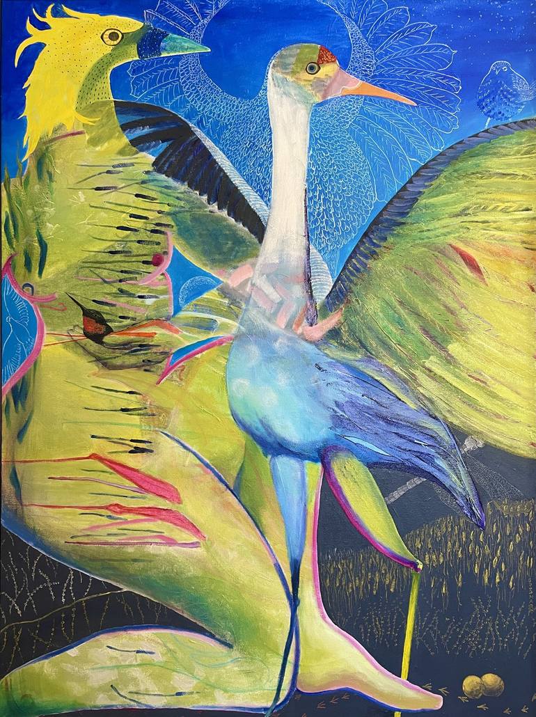 The motives underlying all my paintings are both current and timeless: our common need for sustenance, beauty, and grace. Humans have not changed dramatically since we first appeared and I look for threads of continuity, aiming to make imagery that’s rooted in the mythic, the mystic, and the cycles of Nature. Paintings of vessels, birds, plant life, and human figures are cast as aspects of an elusive yet inviting sanctuary. Frequently the images are rooted in the remnants of ancient cultures, both tangible and oral, but they are always responding to our current world as well. Concurrent with my professional art practice, soon after completing a dual major in fine art and philosophy, I was also an organic farmer from 1988-2017 largely occupied with goats and with effecting alchemical transformations of milk and plants. Those decades of raw, ever-precarious, thoughtful farm experience resonate throughout the artwork, testifying to the cycles & perils of life for all sentient beings, humans included.