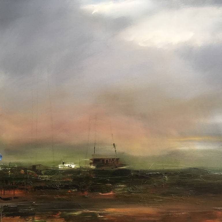 A rural landscape, late Autumn and seen at a speed. I've tried to convey a certain majesty in the man made structures puncturing an otherwise rural setting. I am currently working from my studio in Greece. This painting can be purchased and shipped from the UK as from January 2017.