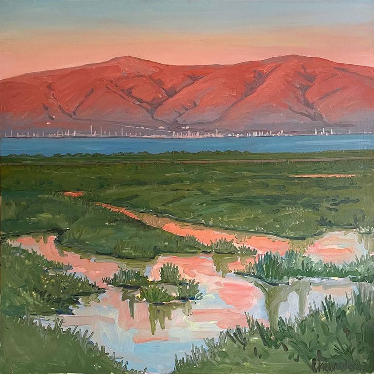 This is a big painting from a small sketch I painted on site at the Palo Alto bayshore of the setting sun hitting the mountains in the East Bay near Fremont.