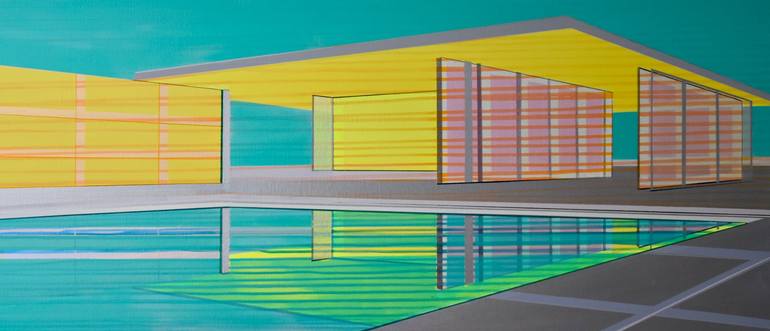 Cécile van Hanja, born in Corsica in 1964 and a graduate of the Gerrit Rietveld Academie in Amsterdam in 1993, is an artist based in Haarlem, Netherlands. Her artistic journey has been deeply influenced by her formative years spent in the South of France, later finding inspiration in the structured landscapes of the Netherlands. Van Hanja’s works epitomize the principles of ‘De Stijl’ and Modernism, notably influenced by Piet Mondrian’s straight lines and the movement’s pursuit of harmony and unity. Her fascination with the ideals of hope and prosperity stemming from these 20th-century movements is evident in her paintings, which often depict modern architectural compositions characterized by rhythmic patterns of verticals and horizontals. Emphasizing intangible aspects by creating open spaces, her paintings feature transparent walls and floors, leading to an interplay of reflections and vanishing points. The deliberate use of thin layers of acrylic and oil paint adds depth and luminosity to her works, allowing underlying colors to shine through and preventing the architectural compositions from becoming static. Cécile van Hanja’s art is renowned for its multi-colored labyrinth of spaces, creating an illusion of depth and complexity within a structured framework of lines and reflections. Her compositions invite viewers to explore the blend between rational and intuitive thinking, offering a unique perspective on modern architectural landscapes through her layered and transparent artistic approach. Her works are displayed in various private collections globally and represented by prominent galleries such as the Fremin Gallery in New York and Saatchi Art’s Samsung Architecture collection. Additionally, Cécile also accepts commissions. If you reside in a modern home and wish to commission a painting, you can submit a request through the Saatchi team, who will facilitate communication with the artist.