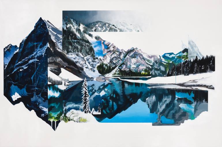 Echo is an acrylic painting on canvas based on a collage of different mountain and lake sources, including the Rocky Mountains in Colorado and BAMF in Canada.