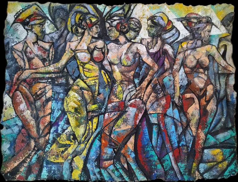 The painting depicts a vibrant scene featuring female figures, with a composition that stands out for its intense colors and expressive textures. The work is inspired by cubism and expressionism, given the use of geometric shapes and superimposed planes, which gives it a dynamic and fragmented appea...