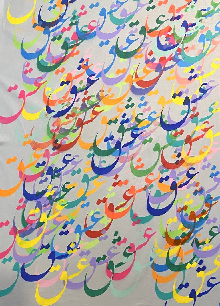 Echoes of Love (طنین عشق) is a vivid exploration of the multifaceted nature of love, expressed through the repetition of the Persian word for love in a spectrum of vibrant spray paint colors. The flowing script, layered in dynamic hues, creates a rhythm that echoes the way love reverberates through ...