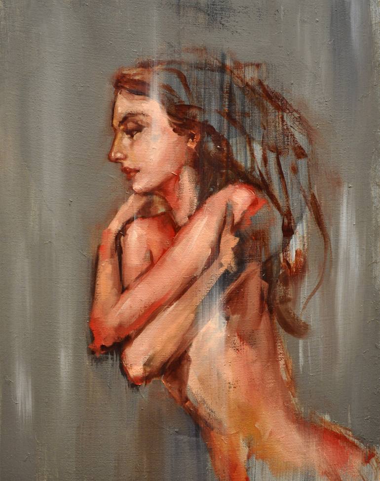 This painting is of a female nude figure in self embrace. Oil on panel.