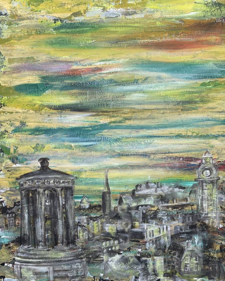 Edinburgh skyline as viewed from Carlton Hill. This original painting depicts the city, with the castle in the background. A colourful sky, is the backdrop to the almost monochrome foreground. The painting is on black primed artboard size 50x40cm. Painted for