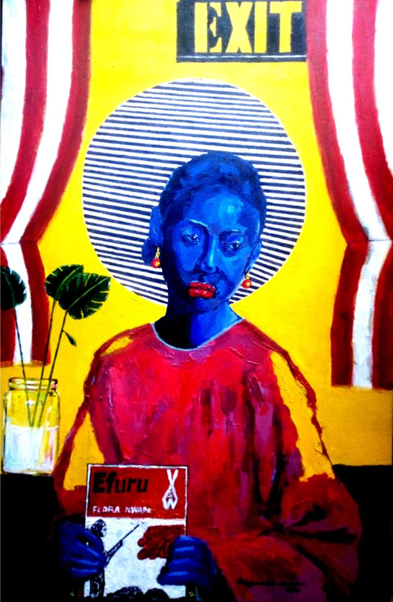 This Piece seek to address a global feminist ,as well Strength of a women... With the resolute female image in the work..artist portray a beautiful lady carried Efuru book in her hand..The hand cover version of the book Efuru showing a black woman on a canoe. Efuru is eponymous novel by Flora Nwa...