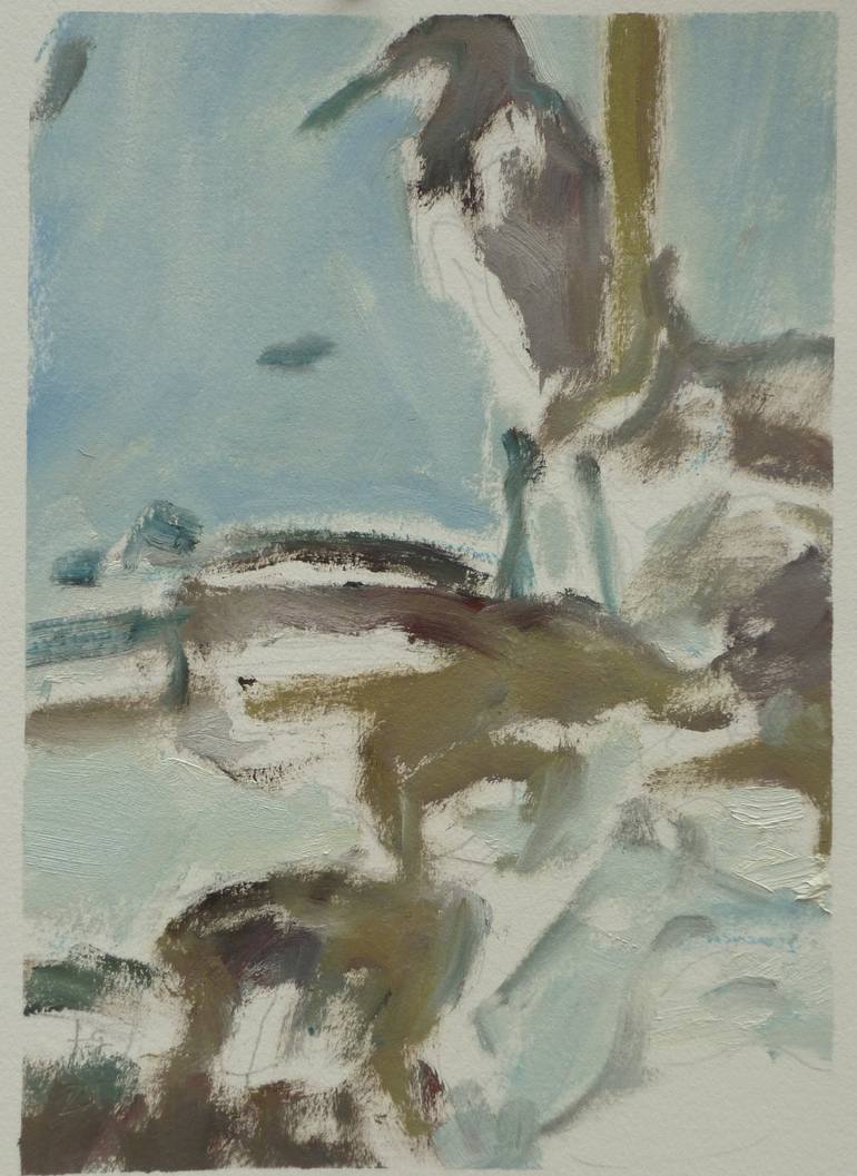 I like to walk at Berkeley Aquatic Park where there are lots of birds. I take photos there. Love to bring the photos to my studio where I paint. This is an oil sketch on a special paper make by Arches a very reputable paper factory in France. This particular painting is abstracted to simple shapes a...
