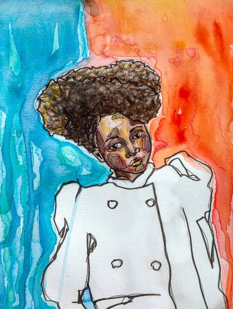 Title: Either/Other Description: A portrait caught between hot and cool, confidence and quiet. Either/Other captures a figure split by emotion and hue—one shoulder in flame, the other in calm sea blue. The watercolor bleeds unpredictably, like a mood spreading under skin, while the ink lines barely...