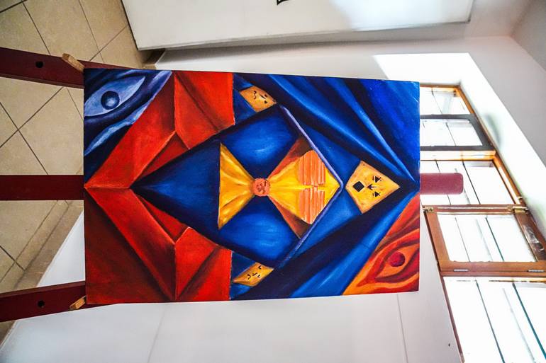 El Grito de una Madre: Angustia y Pena representa el dolor y la desesperación a través de una composición abstracta de formas geométricas y contrastes de color. Los tonos rojos y azules expresan la lucha entre la angustia y la esperanza, mientras que los ojos simbólicos sugieren testigos silenciosos...