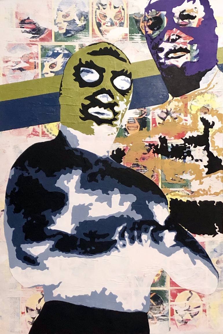 Mixed media image created using ink transfers and acrylic paint. Inspired by the incredible luchadors of Mexico.