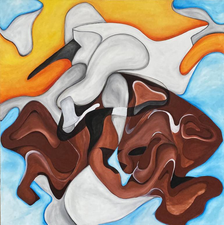 Original Spanish Cowboy wrangling a Mustang. Oil on Canvas 48"x48" I’ve created a version of self fiction or Architectural fiction by communicating my interpretation of shapes, colors, and movement of the impacted and the ongoing man made environmental and social changes. I take these interpretati...