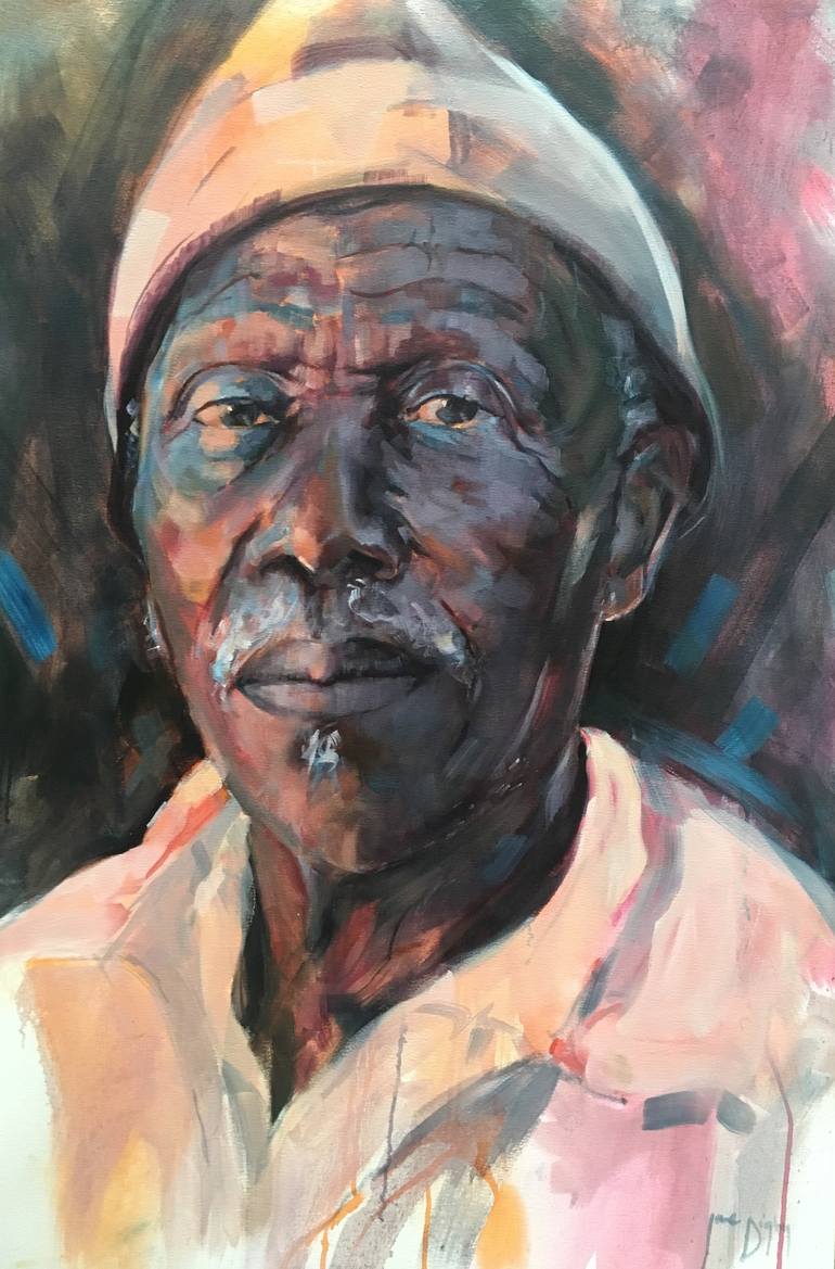 An elder from a rural coastal village on the east coast of South Africa, this painting aims to show the dignity and wisdom of this elder and leader in his community.