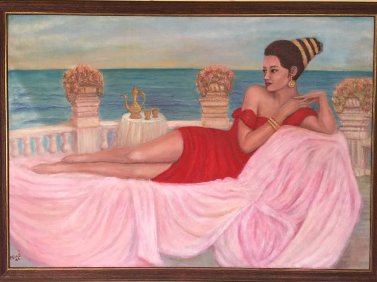 Oil painting on canvas representing an elegant and beautiful woman sitting confortable on the balcony with a view on the sea gazing at the horizon, relaxing and enjoying the day
