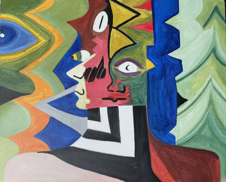 This work depicts colonization. In the central figure, one can observe a single man with multiple faces. Behind the white face looking to the left, sharing the same gaze, is the rosy face of the billionaire with his bushy mustache. To his right is the face of the violated indigenous man, who destro...