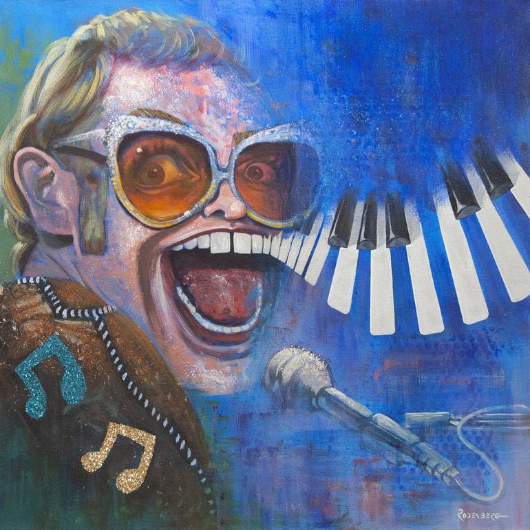 I've been a fan of Elton John since the 1980s and his music has been a big part of my life through the years. I've tried to capture the outrageousness and energy of Elton's live performance by including glitter and vibrant colors in this painting. A definite one-of-a kind conversation piece. Pain...