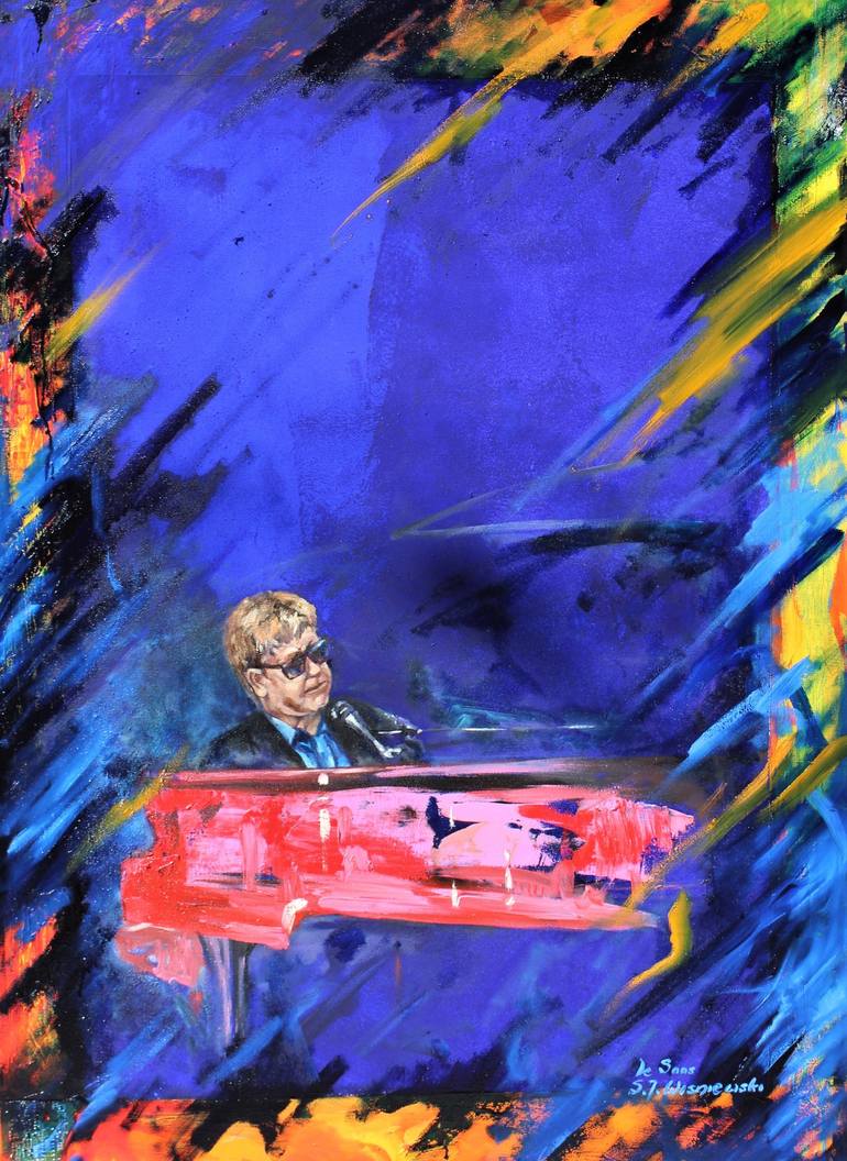Painting of Elton John at concert with vibrant colors expressing sounds. Oil on canvas however the original IKB /Yves Klein Blue/ was used to enrich the atmosphere of the concert.