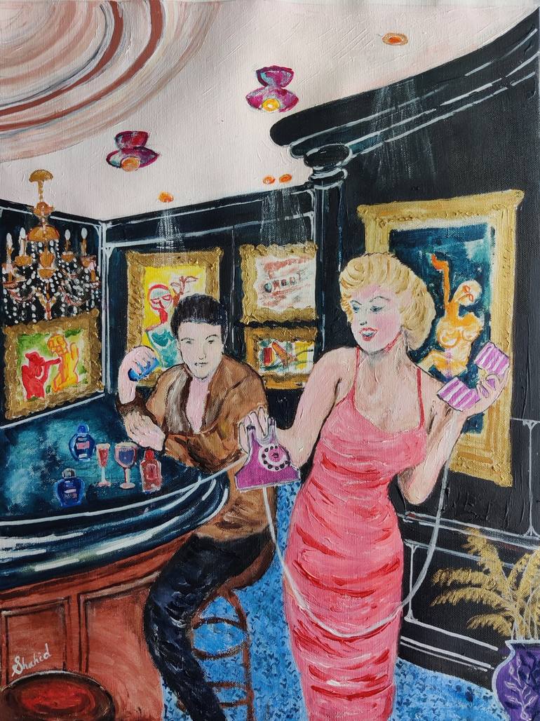 This unique painting brings two iconic pop icons of all times together in a jovial setting. Although their era overlapped they never performed together on stage or films. This feel good artwork brings them together on canvas. This is entirely hand painted in acrylic on canvas. Please there is a 9 cm...