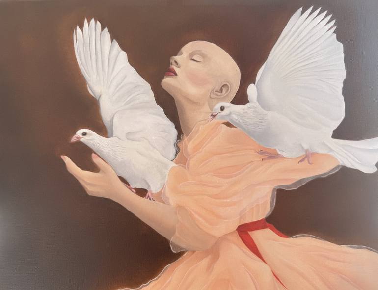 This painting is a meditation on peace, freedom, and the resilience of the human spirit. Inspired by the universal symbolism of doves, I chose to portray a bald woman — a figure of strength and vulnerability — gently cradling two white doves. Her soft, flowing garment and serene expression create a ...