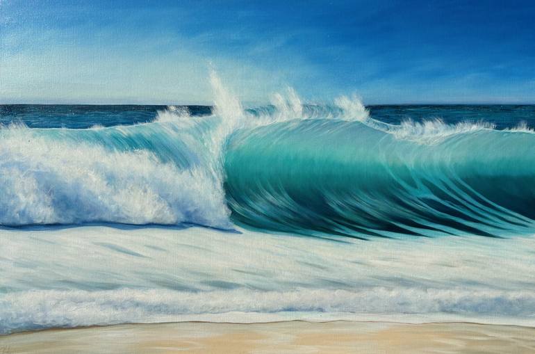 Emerald Wave IV original seascape oil painting on canvas. Width 120cm x Height 80 cm or 47.25 x 31.5 inches. Signed. Framed in a white washed wooden frame. Framed dimensions are 124 x 84 cm or 48.75 x 33 inches Comes with a certificate of authenticity. Free UK Shipping. Inspiration Emerald Wave IV i...