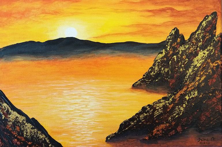 I wanted to create a magical picture with depth and mystery, so this beautiful sunset appeared. Glitters were used in the picture. If you send me a frontal photo of your wall. I can insert a picture into your interior.