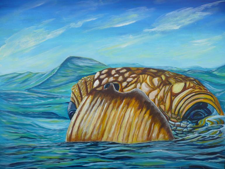 This painting of a sea turtle emerging from the ocean's surface is a stunning piece of art. The close-up perspective adds a sense of intimacy and intrigue, allowing viewers to appreciate the creature's beauty and the textures of its surroundings. This mesmerizing seascape, "Emergence," captures th...