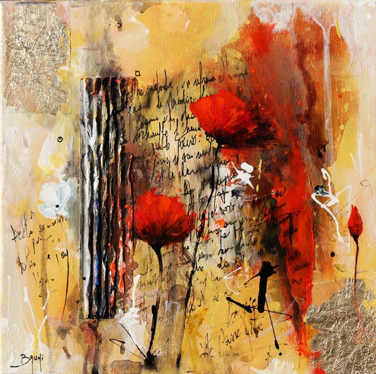 Knife painting and collage on Canvas. The work mainly represents 2 bright red poppies on an abstract background with writing. Presence of gold paper and glued cardboard. In this work, I explore the fragile balance between chaos and harmony. Using acrylic, collage and gilding, I aspire to capture a s...